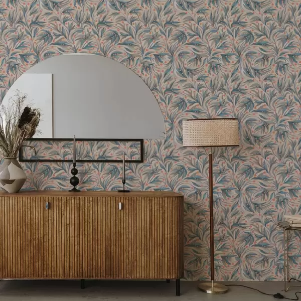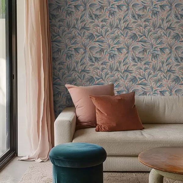 Tapeta Abstraktné modré lístie s koralovými kvetmi Nr. a00852