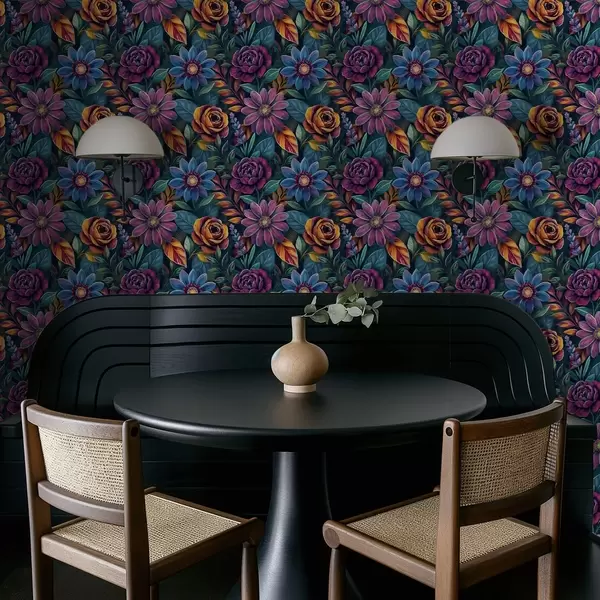 Tapeta Živé kvetinové motívy v odtieňoch drahokamov na tmavomodrom pozadí Nr. a00871
