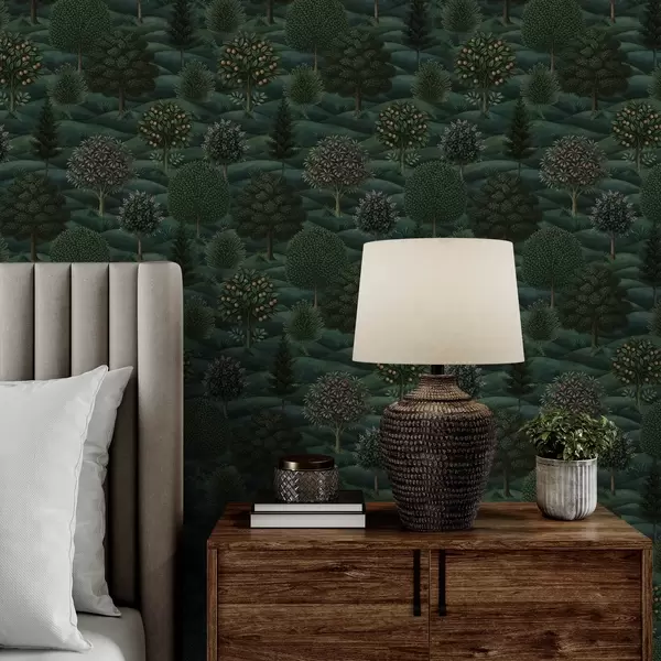 Tapeta Bohatá zelená kopcovitá krajina s vzorovanými stromami Nr. a00892