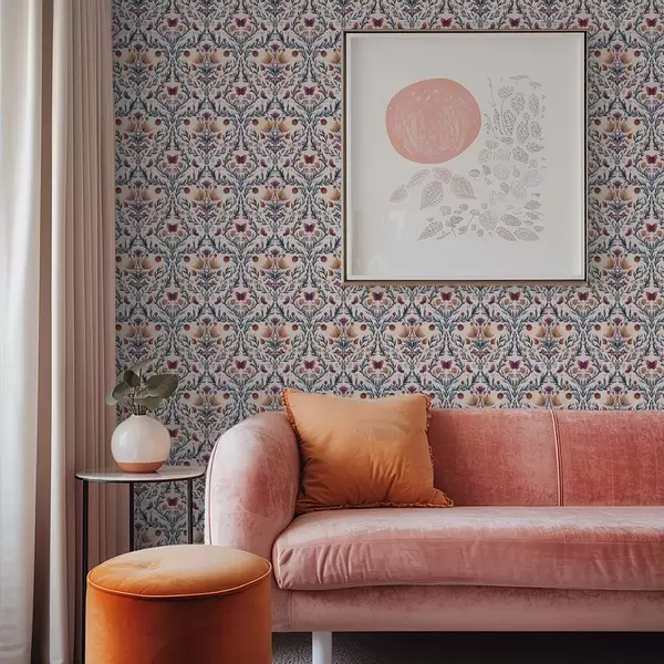 Tapeta Kvetinový damask s motýľmi na jemnom broskyňovom pozadí Nr. a00926