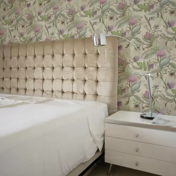 Tapeta Lila púčiky a jemná zeleň na smotanovom pozadí Nr. a00930v2