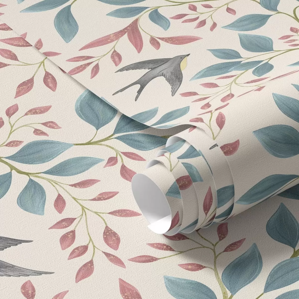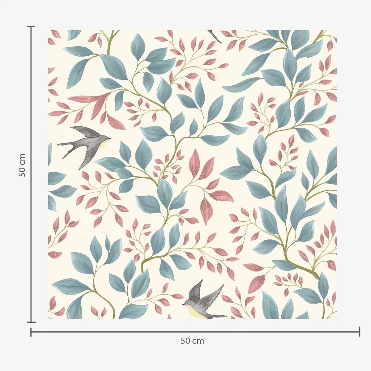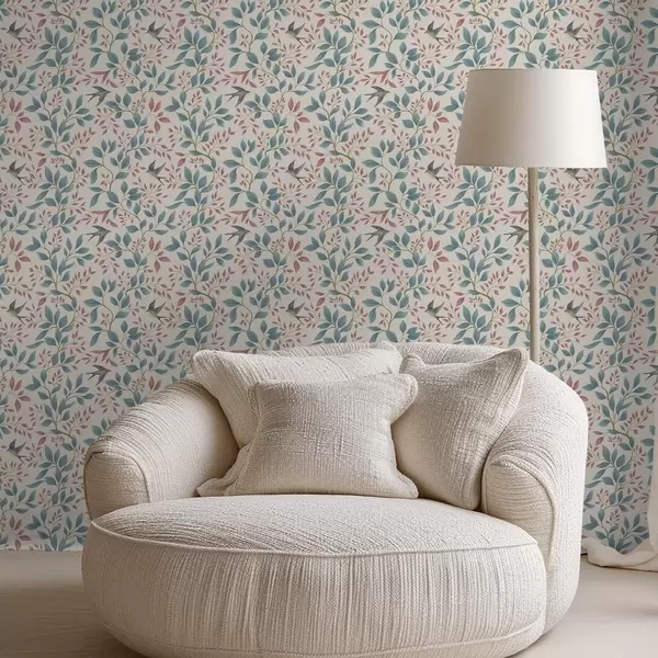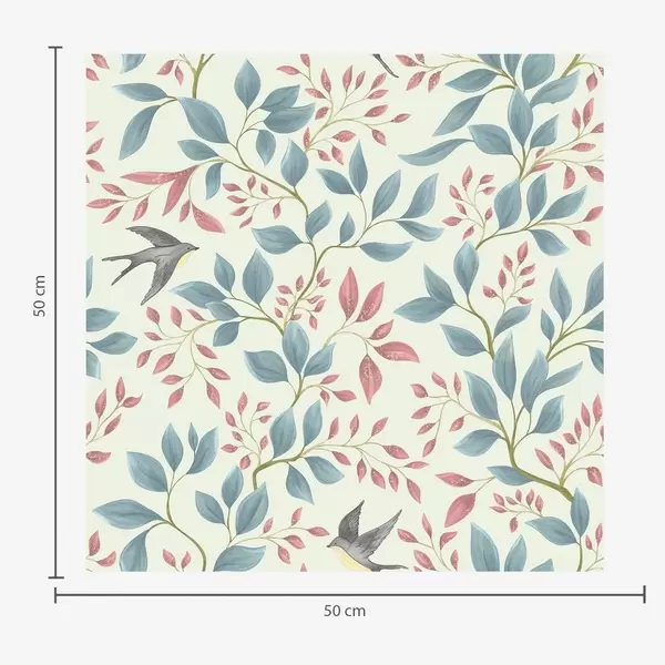 Tapeta Modré a ružové vetvy s vtákmi na smotanovom pozadí Nr. a00933