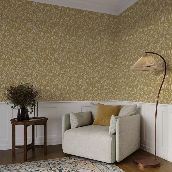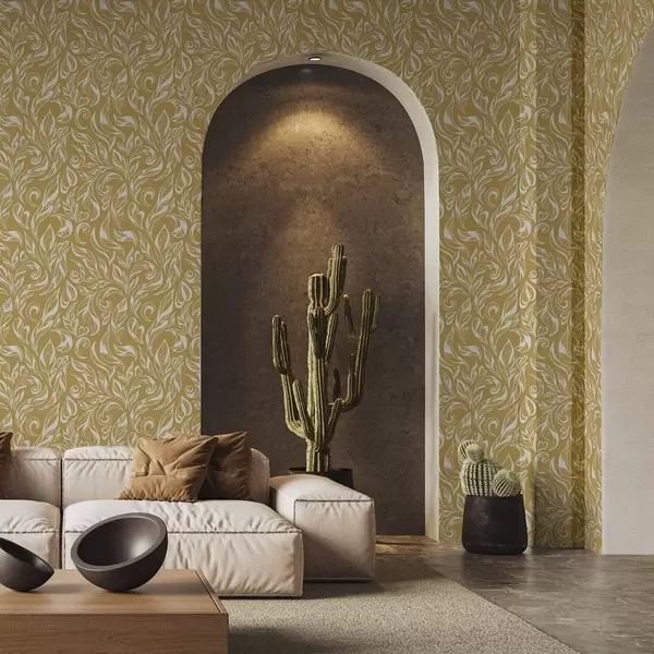 Tapeta Krémovo-biely listový ornament na teplom okrovom pozadí Nr. a00940v1