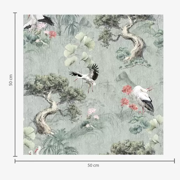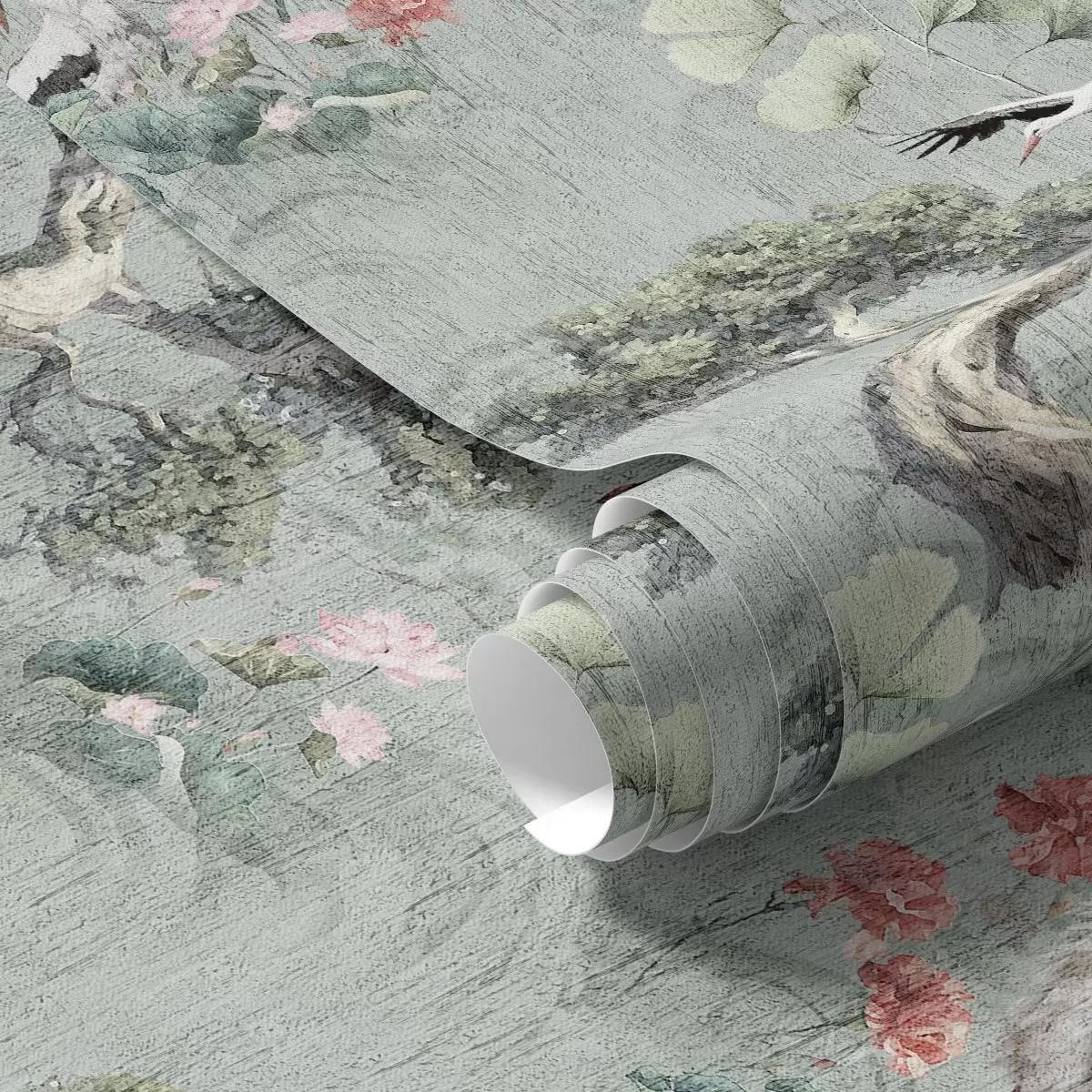 Tapeta Žeriavy medzi borovicami a lotosmi na pokojnom zelenom pozadí Nr. a00962
