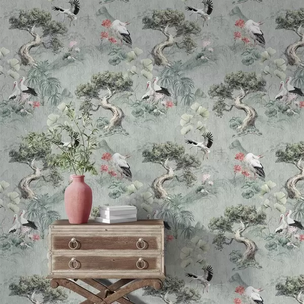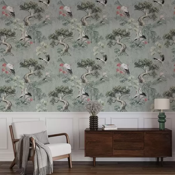 Tapeta Žeriavy medzi borovicami a lotosmi na pokojnom zelenom pozadí Nr. a00962