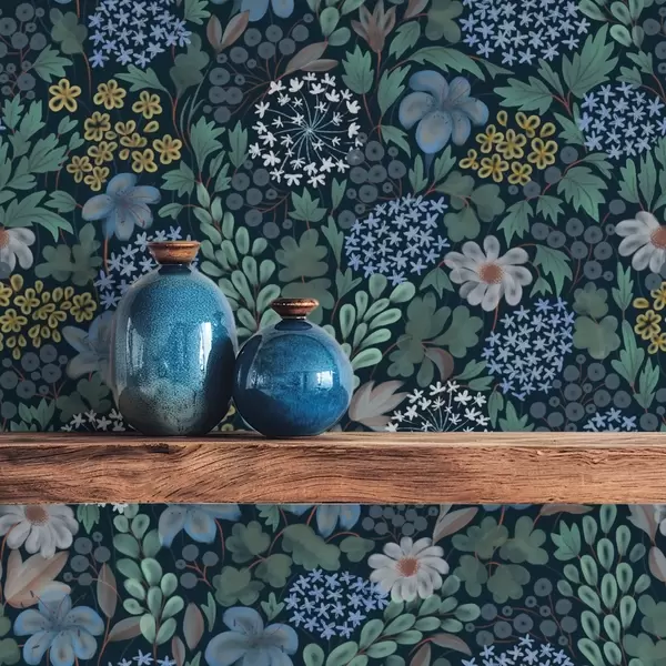 Tapeta Nočná záhrada s modrými ľaliami, bobuľami a divokou zeleňou Nr. a00996