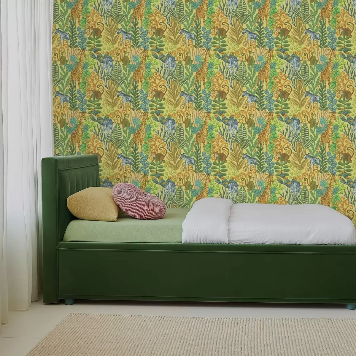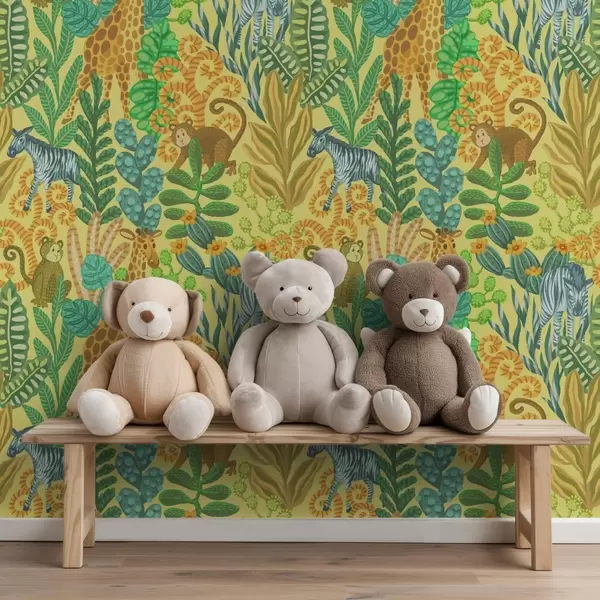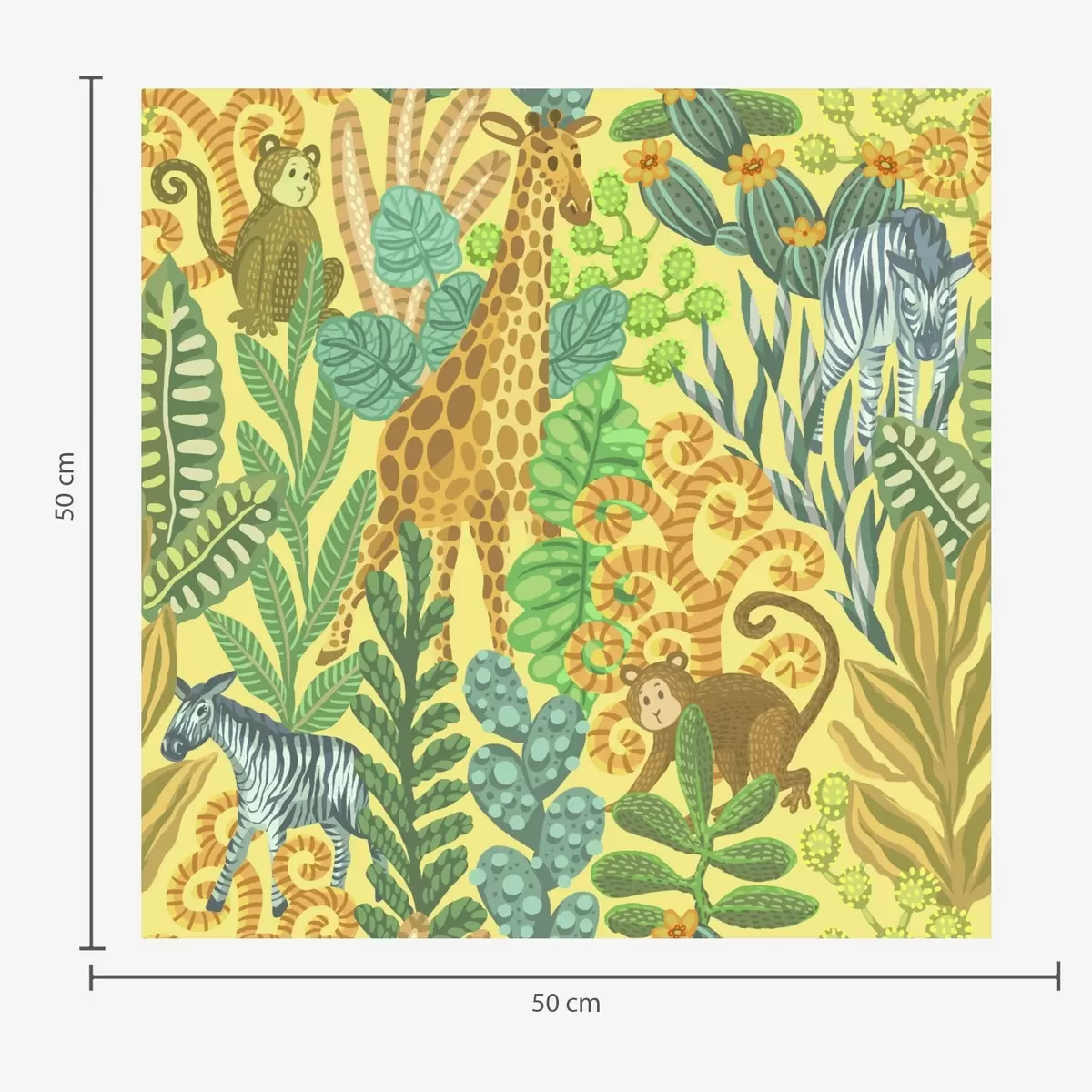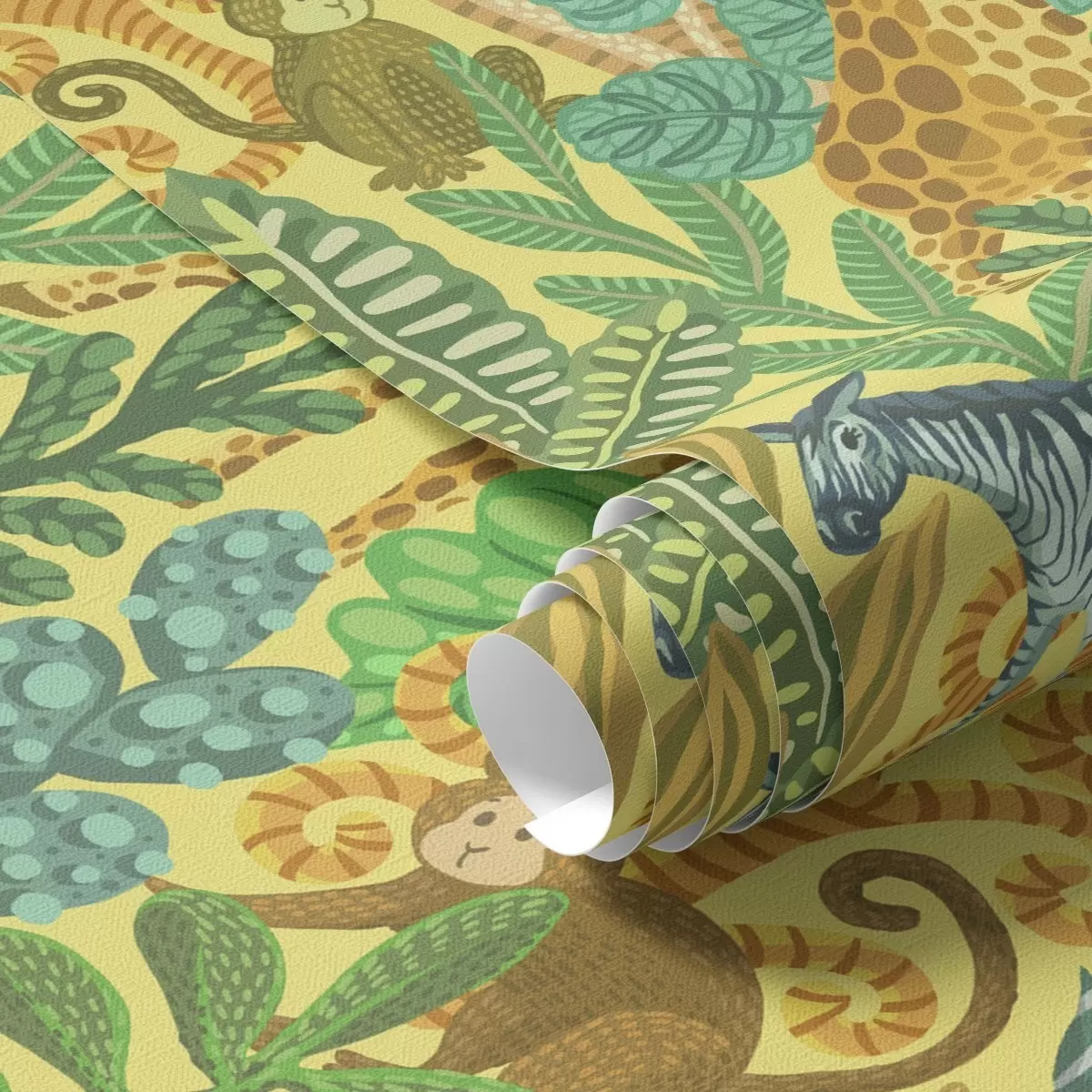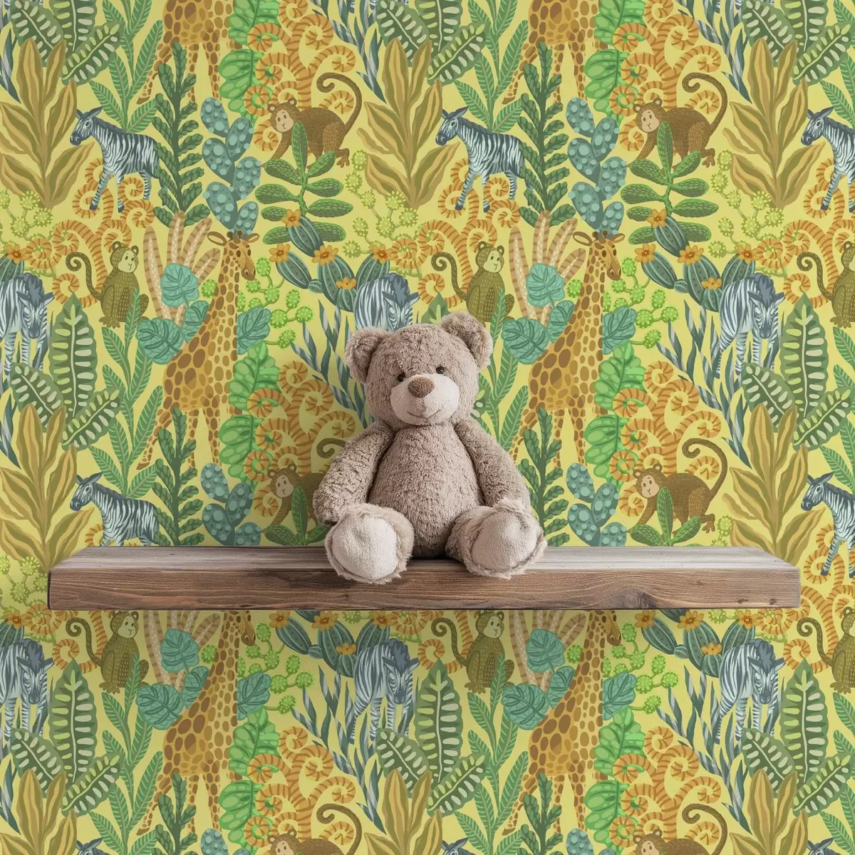 Tapeta Žirafa, zebra a opica v jasne žltej savane Nr. a01000v1