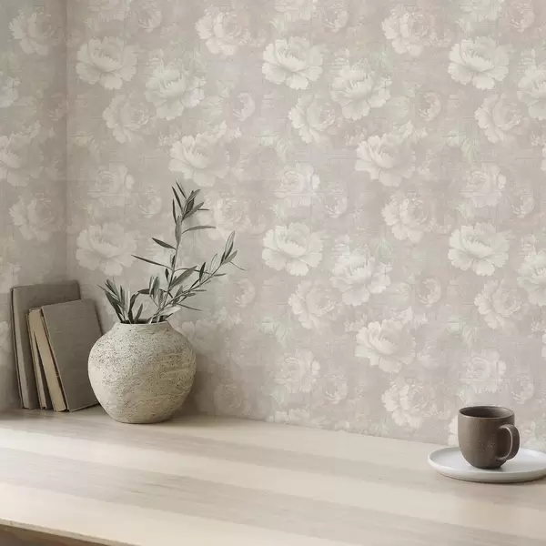 Tapeta Vyblednuté pivonky na ľanovej textúre v jemnej béžovej palete Nr. a01018