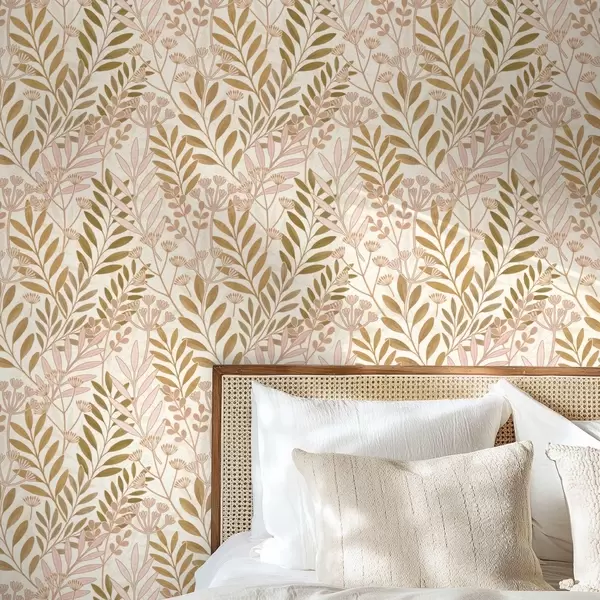 Tapeta Ľahký botanický vzor s jemnými ružovými a ovsenými odtieňmi listov Nr. a01020v1