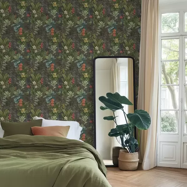 Tapeta Tmavá tropická záhrada s jasnými kvetmi a zeleňou Nr. a01079